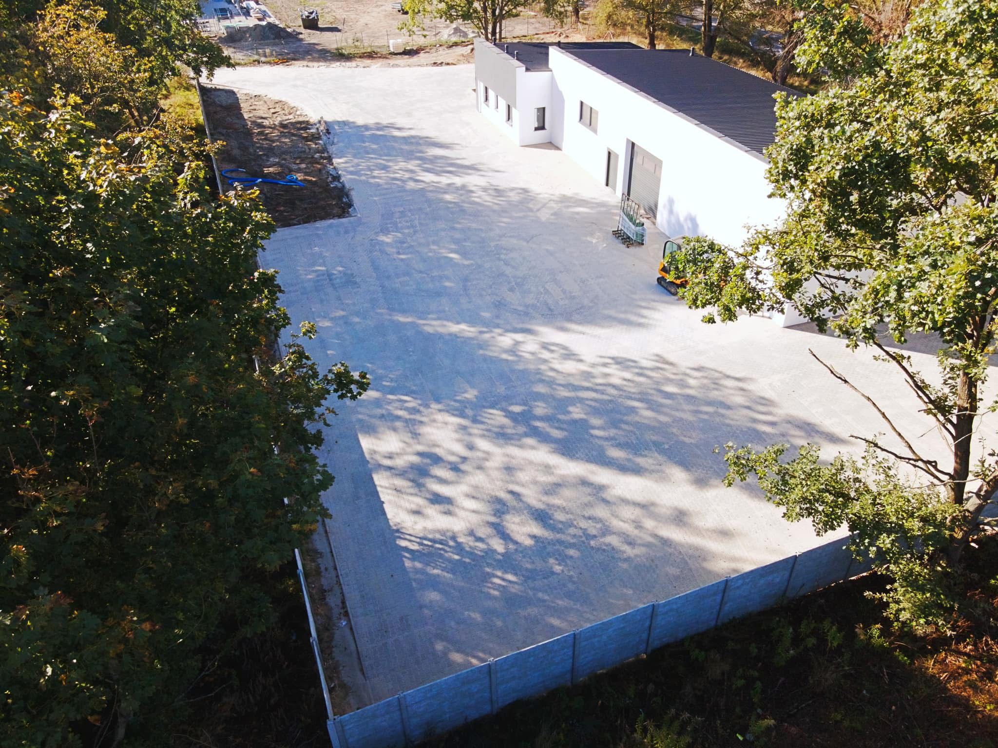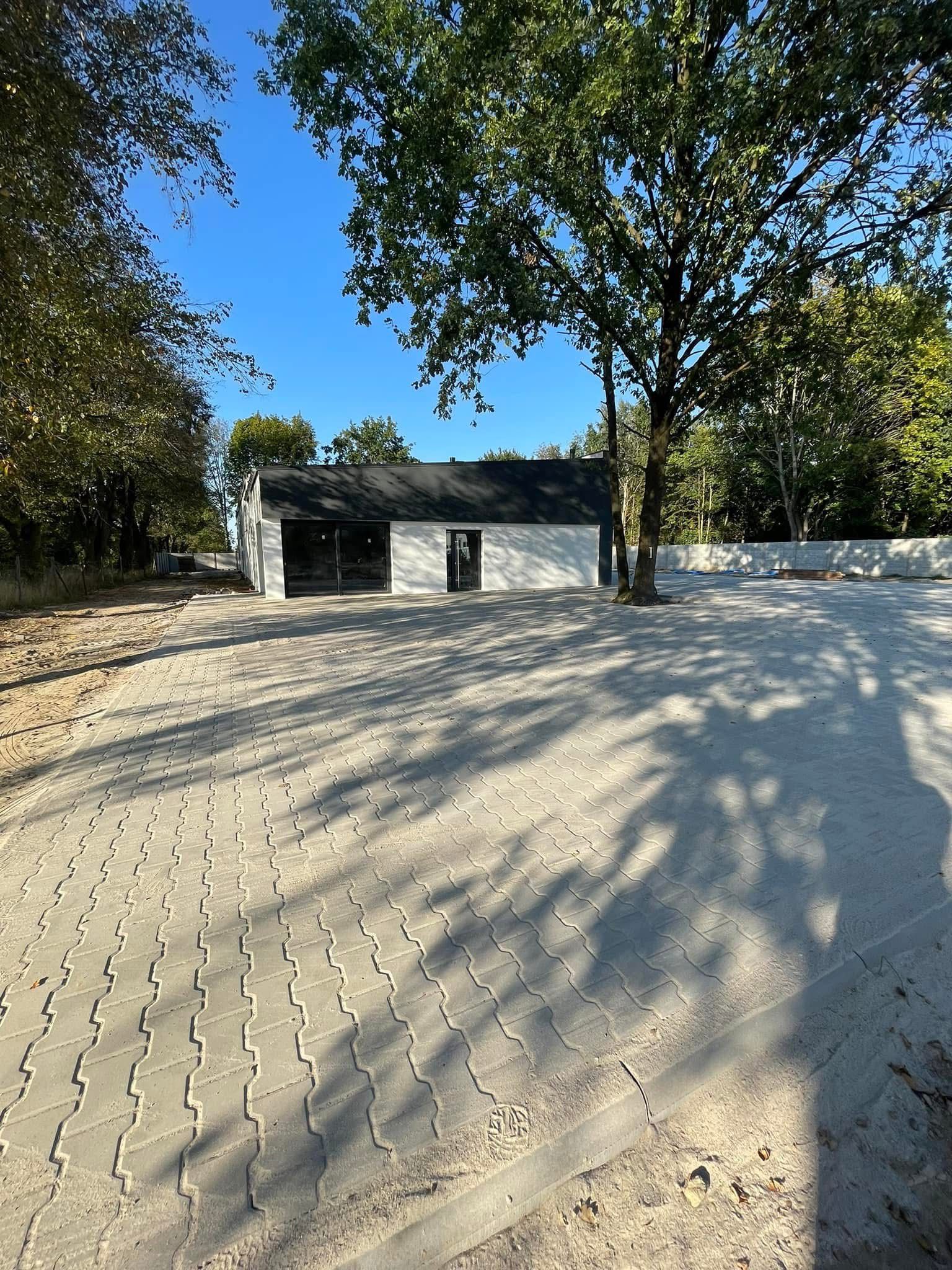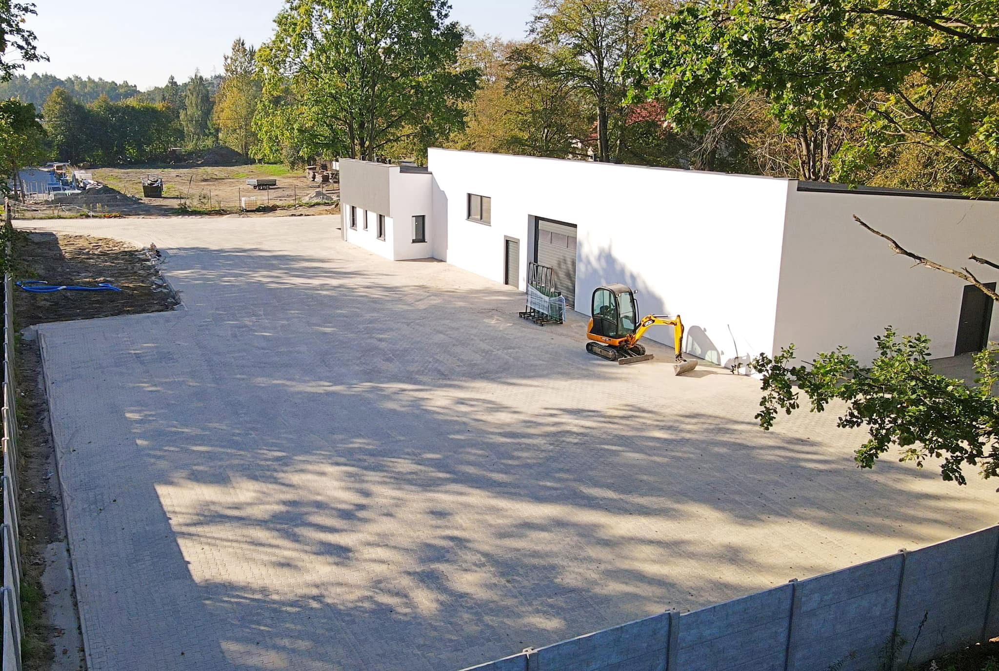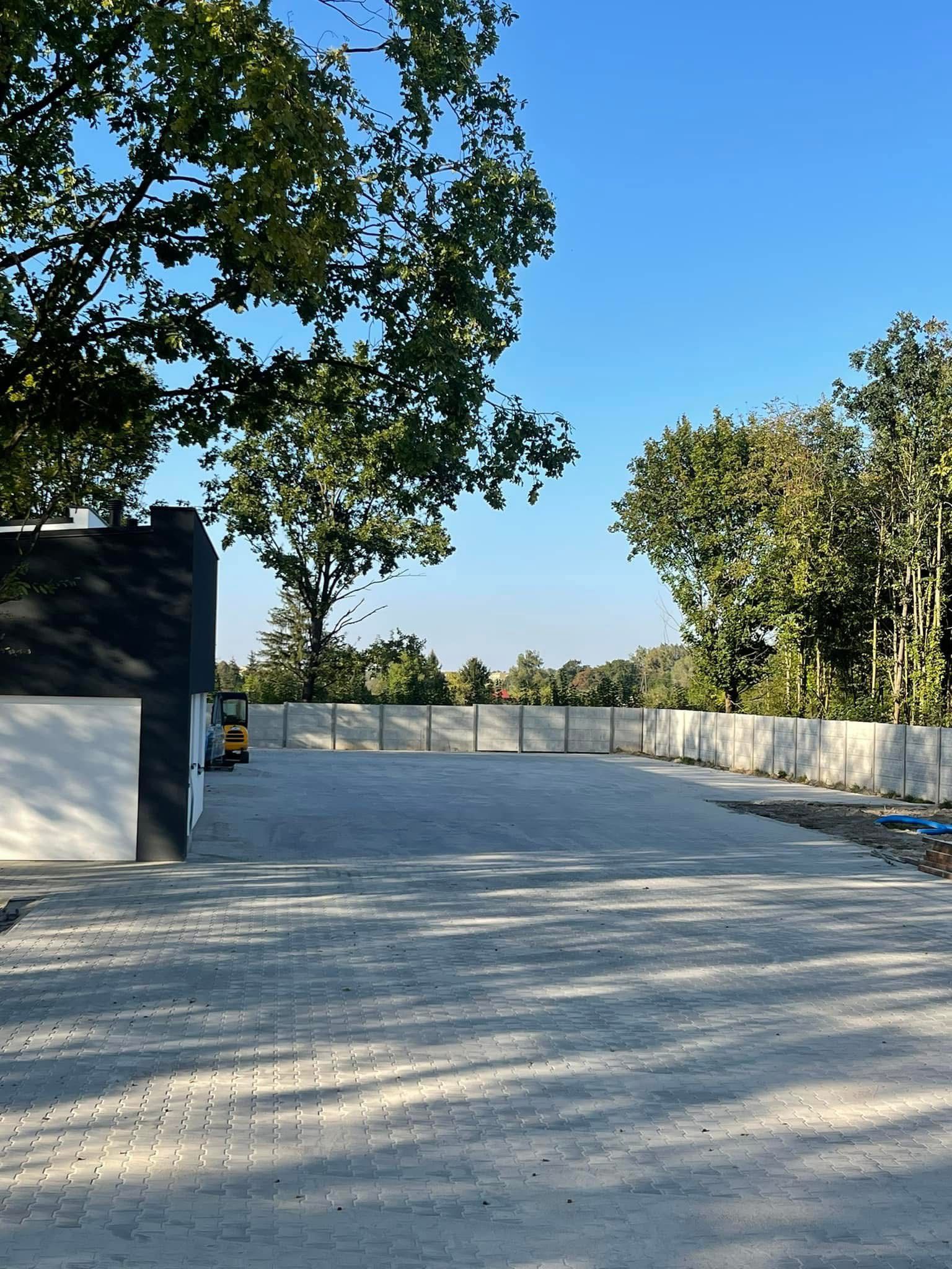Wir haben rund um das neu errichtete Gebäude eine 1600 m² große Pflasterfläche angelegt. Das Projekt umfasste die Schaffung einer großen Nutzfläche, die für intensiven Fahrzeugverkehr ausgelegt ist.