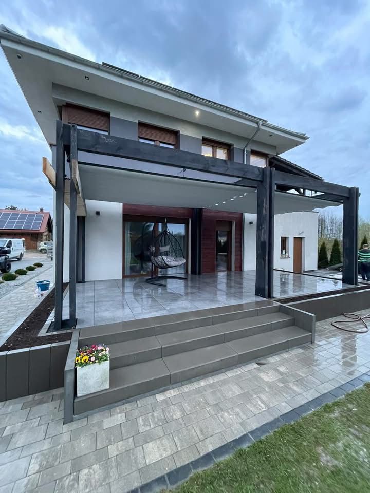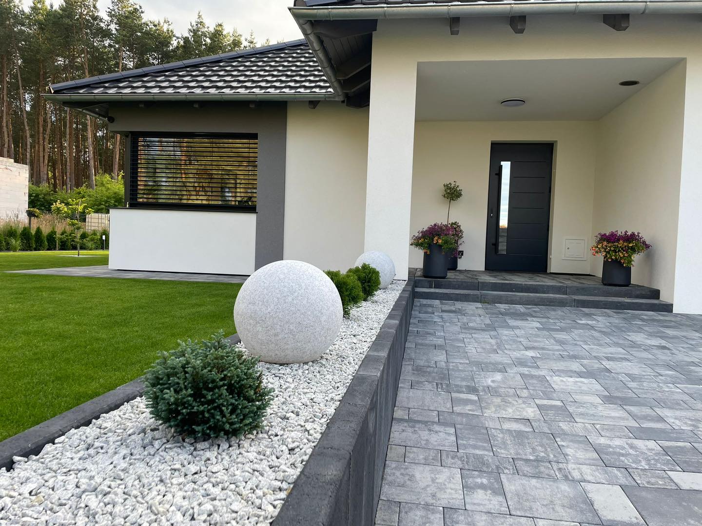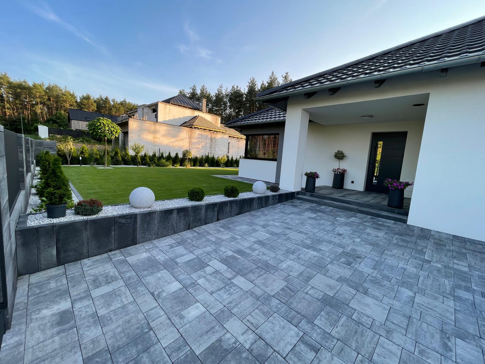 Wir haben die umfassende Gestaltung des Außenbereichs rund um ein modernes Gebäude in Stettin realisiert. Das Projekt umfasste die Gestaltung der Terrasse, der Verkehrswege sowie des Eingangsbereichs, wodurch ein einheitlicher und funktionaler Raum rund um das Haus geschaffen wurde.