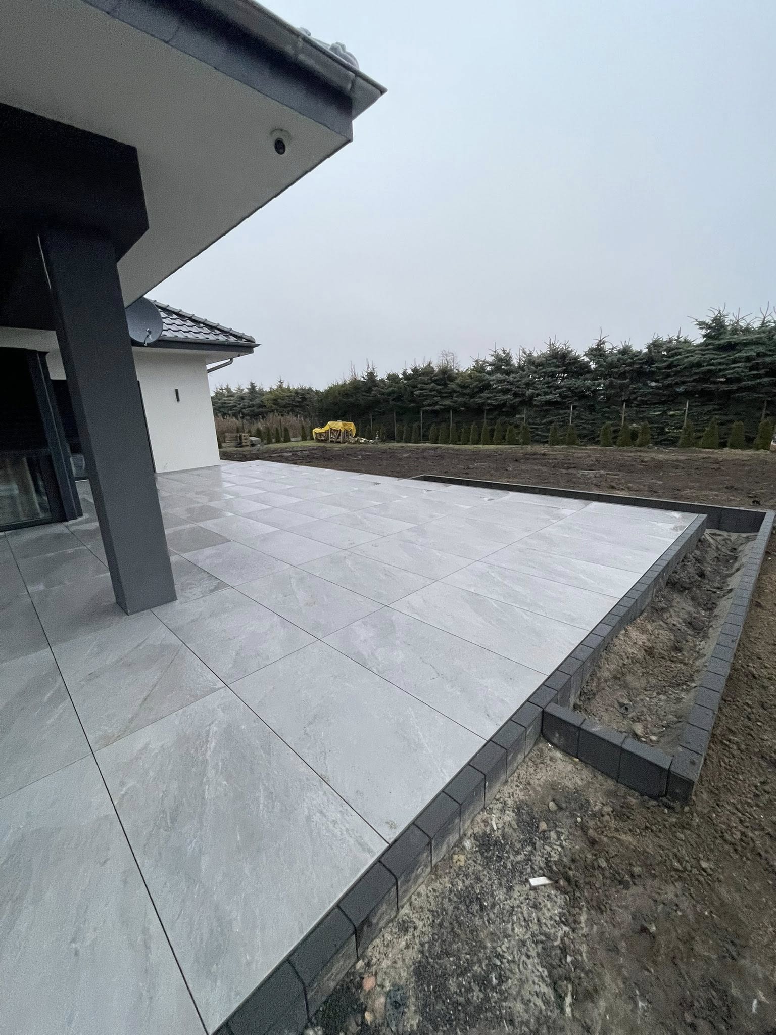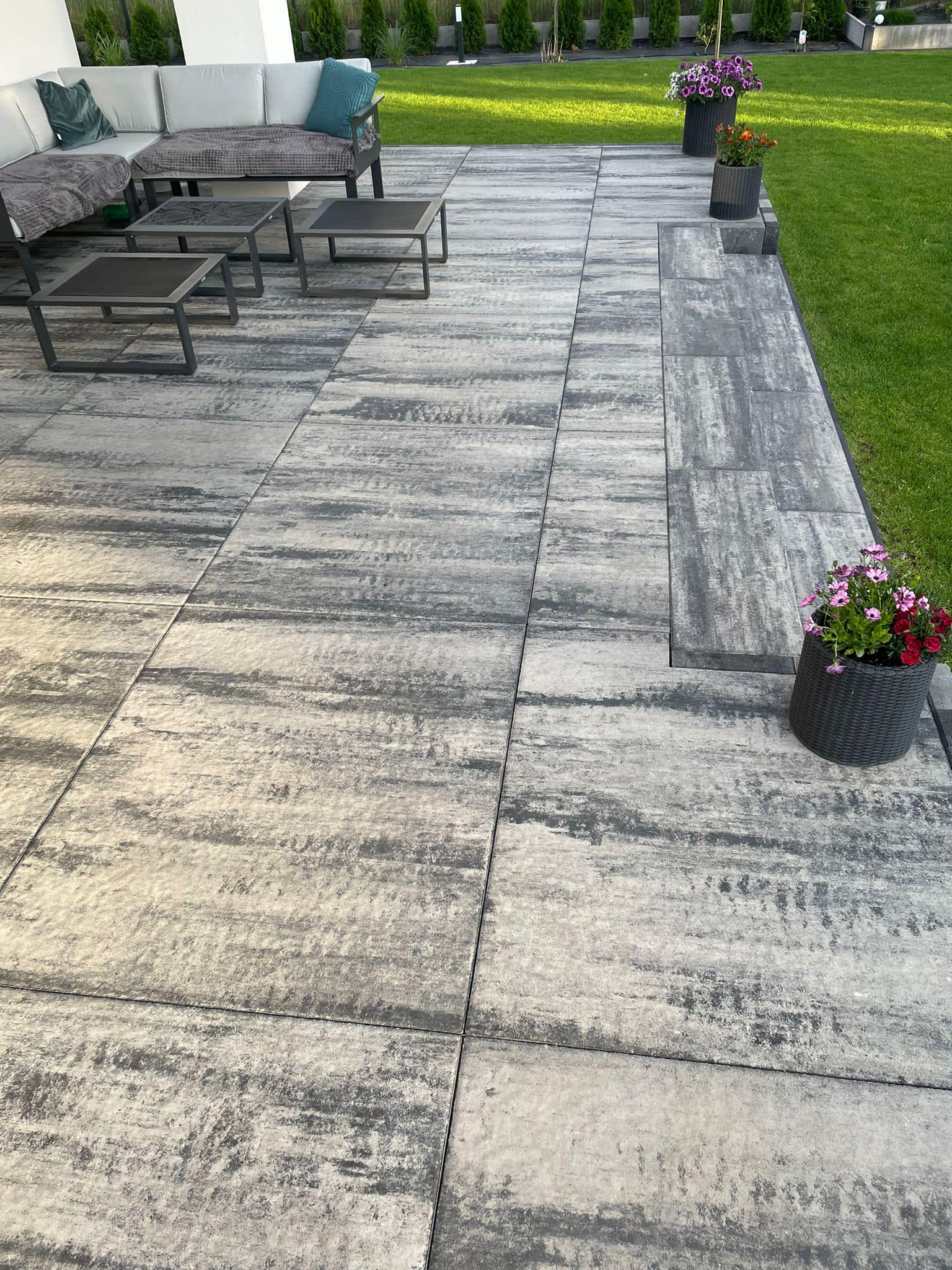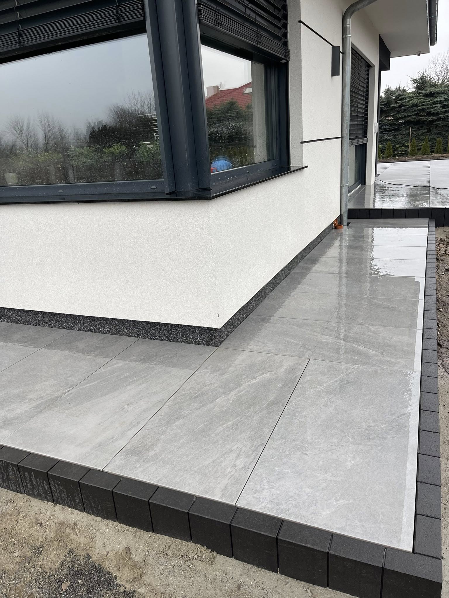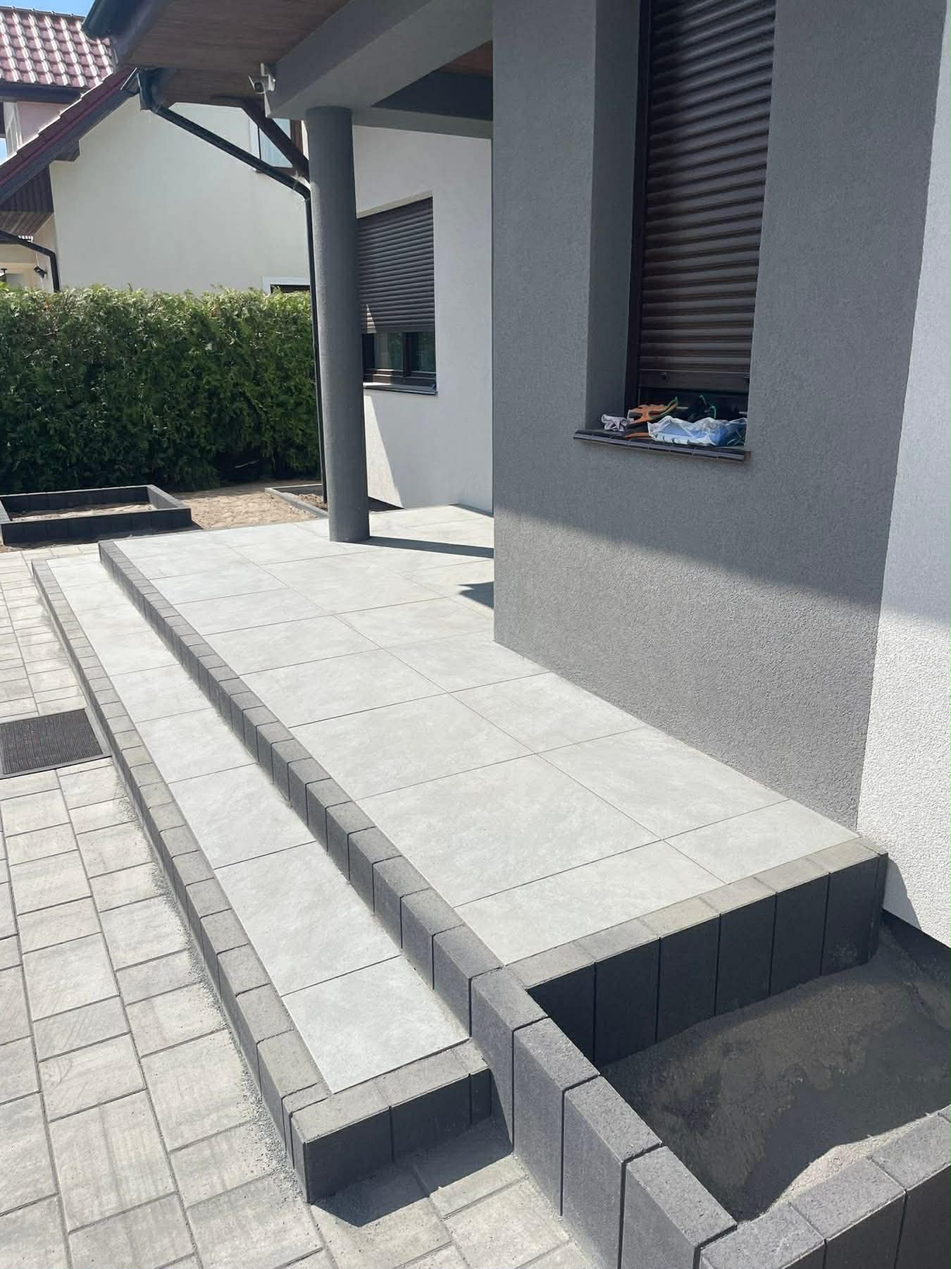 Wir haben großformatige Feinsteinzeugplatten mit einer Stärke von 2 cm (120×60) verwendet, die dem Ganzen einen minimalistischen, modernen und zeitlosen Charakter verleihen. Dank der entsprechenden Vorbereitung des Untergrunds und der präzisen Verlegung ist der Belag langlebig, ästhetisch und witterungsbeständig.