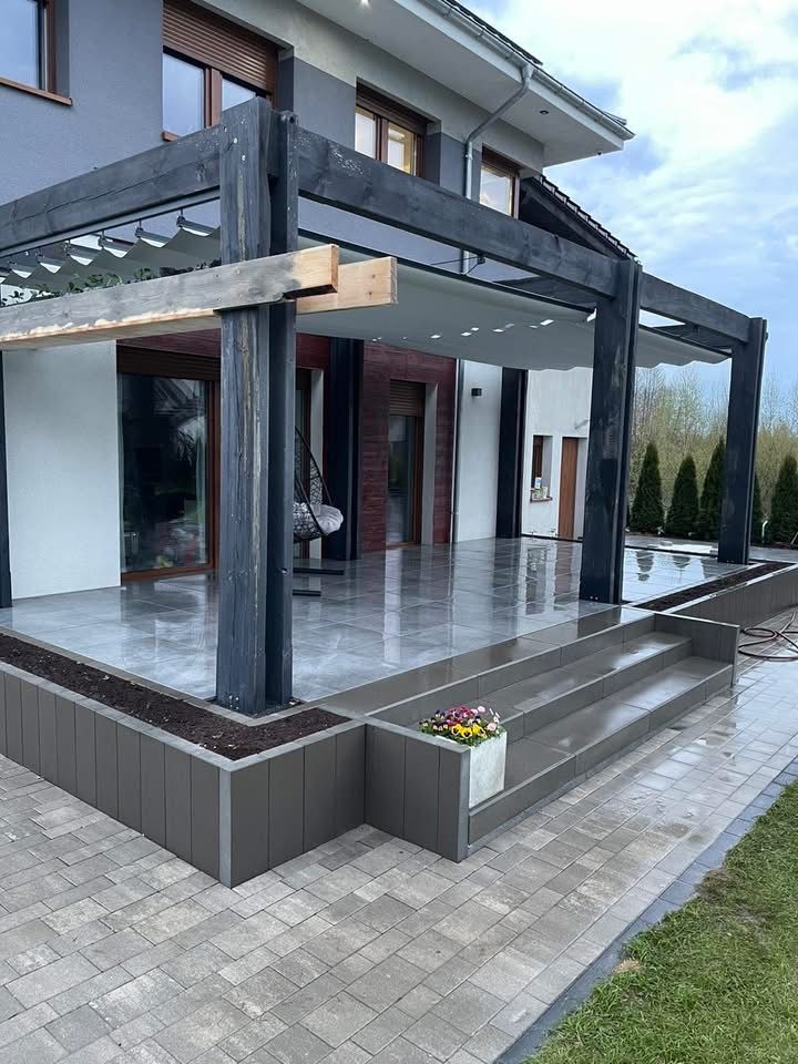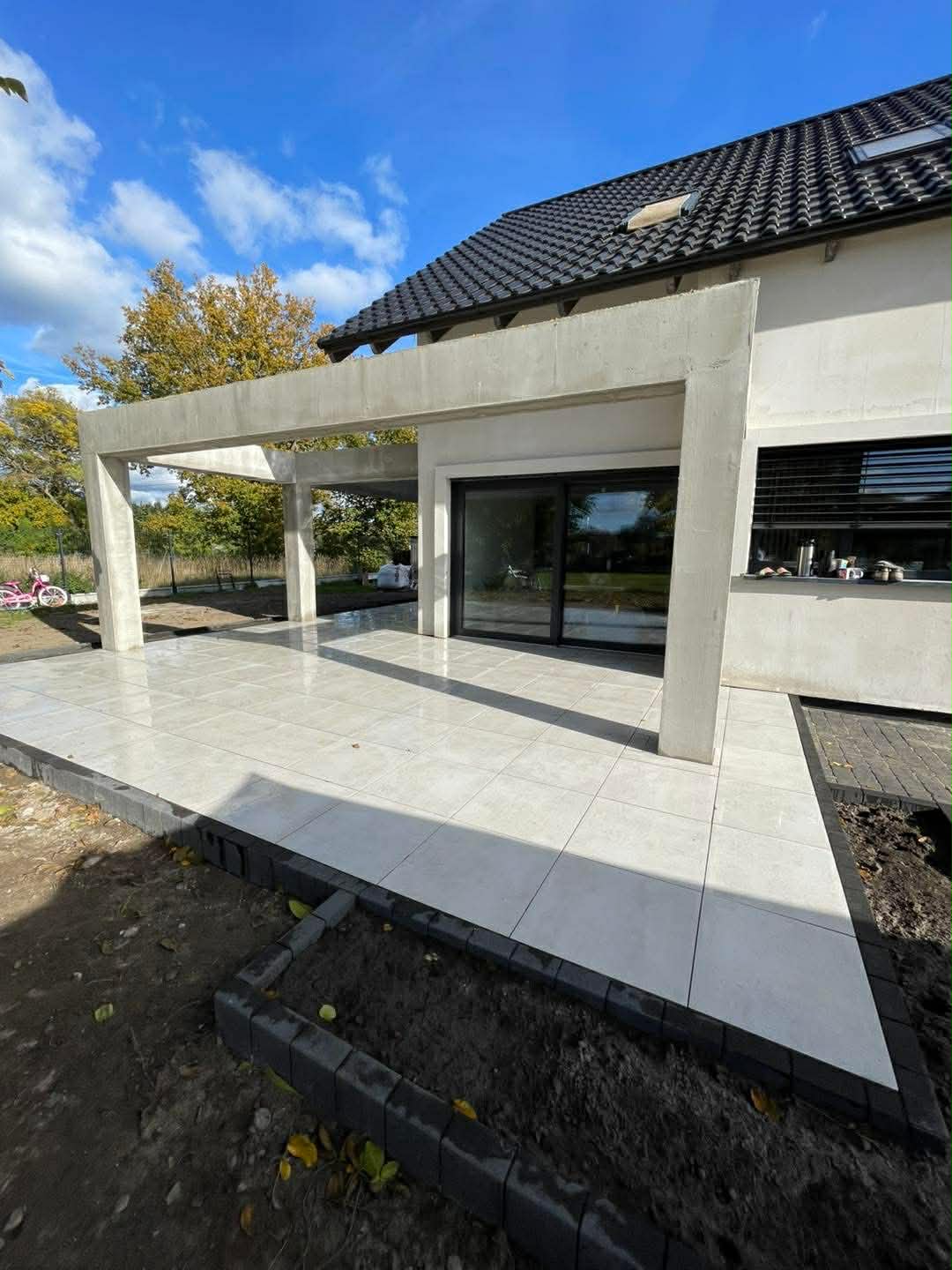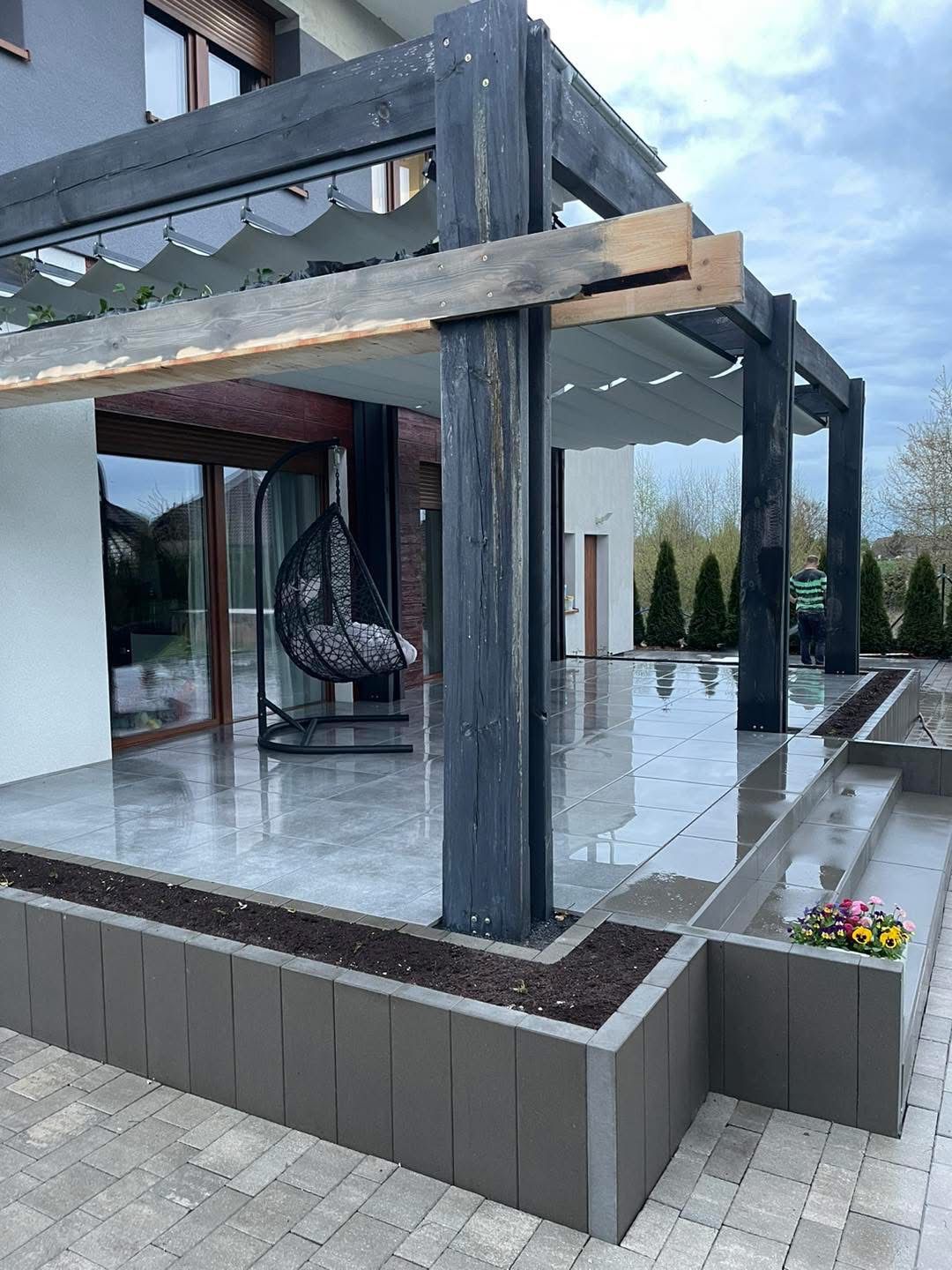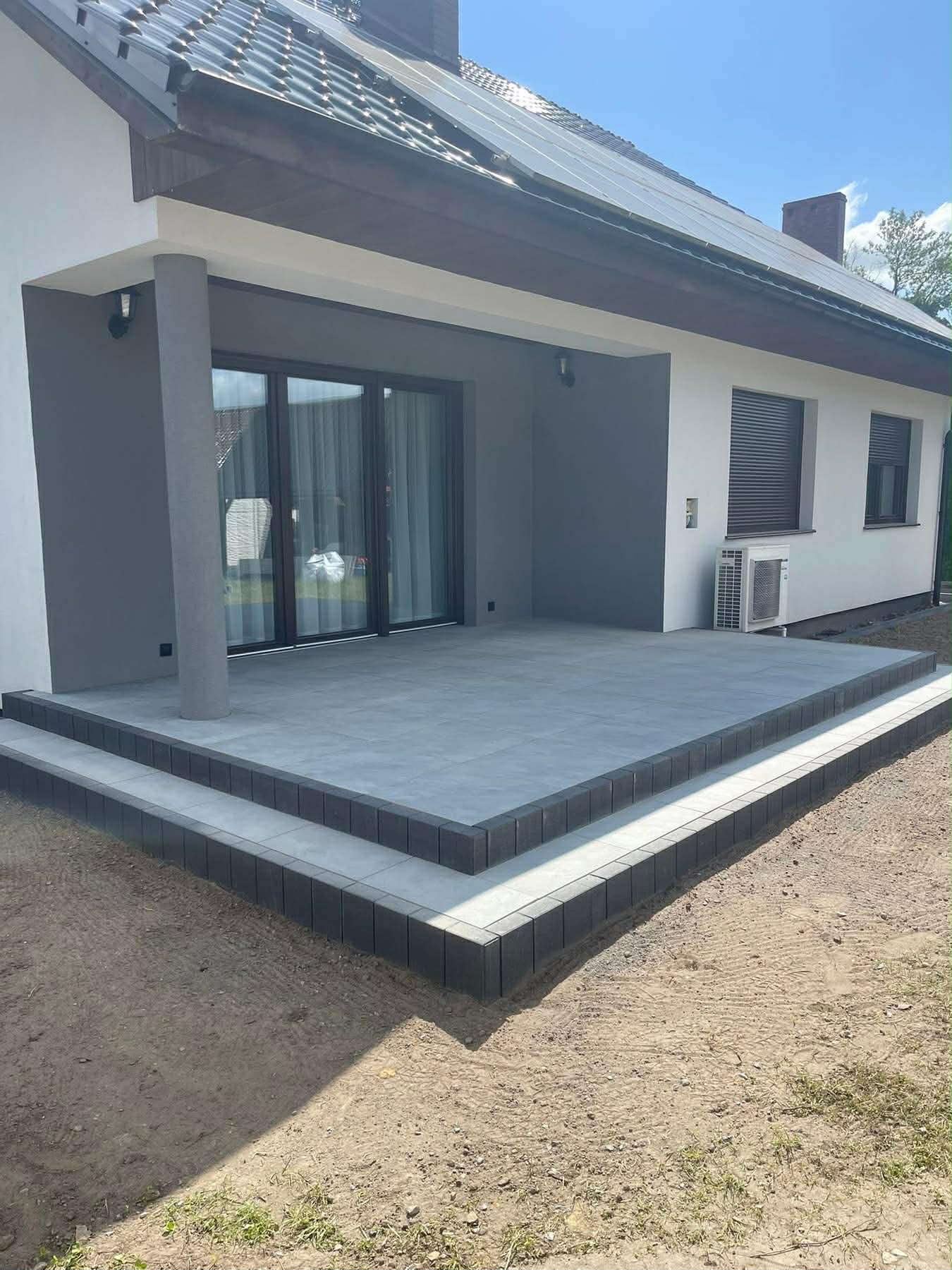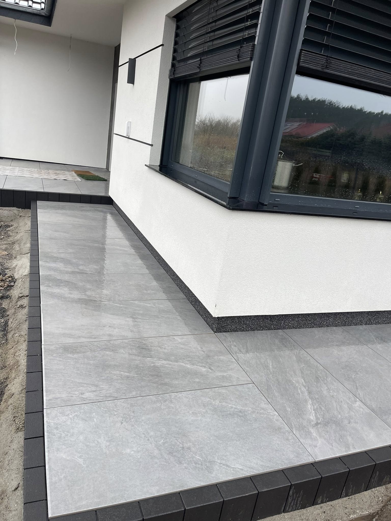 Wir haben großformatige Feinsteinzeugplatten mit einer Stärke von 2 cm (120×60) verwendet, die dem Ganzen einen minimalistischen, modernen und zeitlosen Charakter verleihen. Dank der entsprechenden Vorbereitung des Untergrunds und der präzisen Verlegung ist der Belag langlebig, ästhetisch und witterungsbeständig.