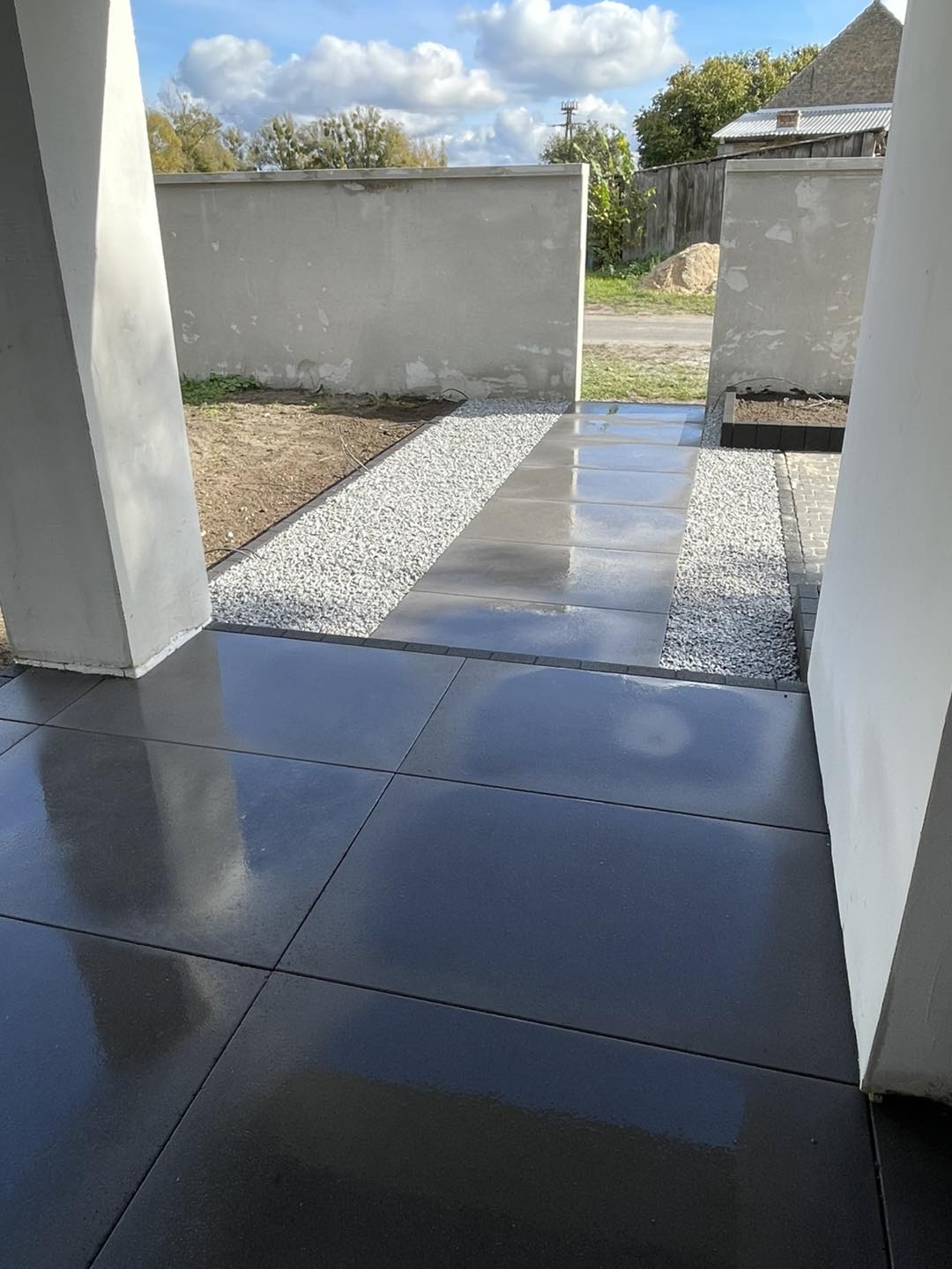 Die Arbeiten umfassten die Verlegung eines Pflasters in Grautönen sowie die Gestaltung des Eingangsbereichs und der Terrasse. Dabei kamen Feinsteinzeugplatten mit Ziersteinfüllung sowie großformatige Platten auf der Terrasse zum Einsatz.