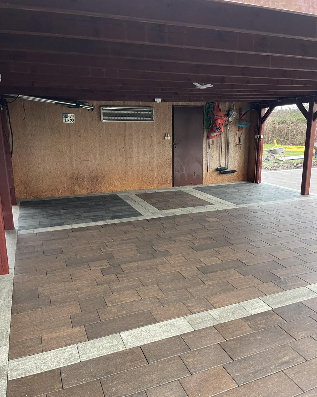Das gesamte Projekt wurde auf einem soliden Unterbau ausgeführt, der für größere und schwerere Fahrzeuge ausgelegt ist. Es wurde eine Unterfüllung aus 2/5-Splitt verwendet, was für Langlebigkeit, Stabilität und eine angemessene Entwässerung der Oberfläche sorgt.