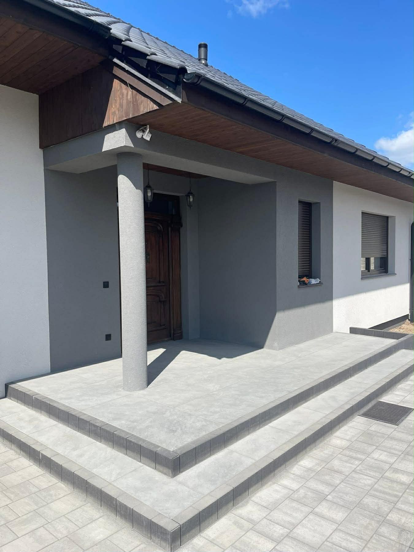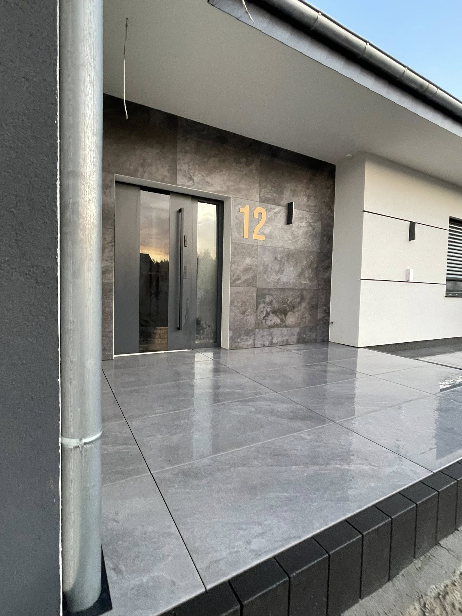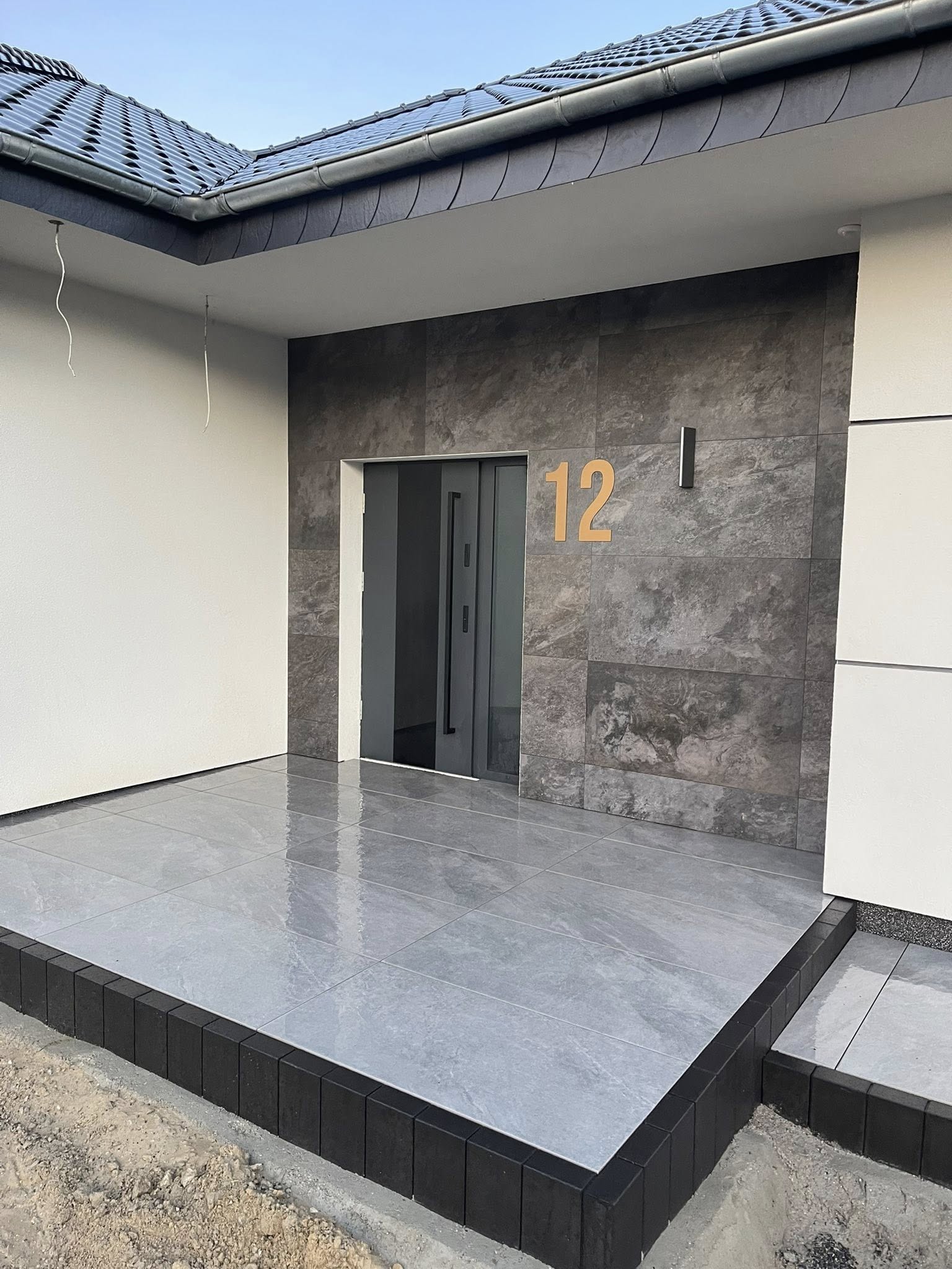 Wir haben eine umfassende Umsetzung durchgeführt, die die Auffahrt, den Eingangsbereich und die Terrasse umfasst. Im Verkehrsbereich wurden Pflastersteine verwendet, während am Eingang und auf der Terrasse Feinsteinzeugplatten im Format 60×60×2 cm zum Einsatz kamen, was dem Ganzen ein modernes und einheitliches Erscheinungsbild verleiht.